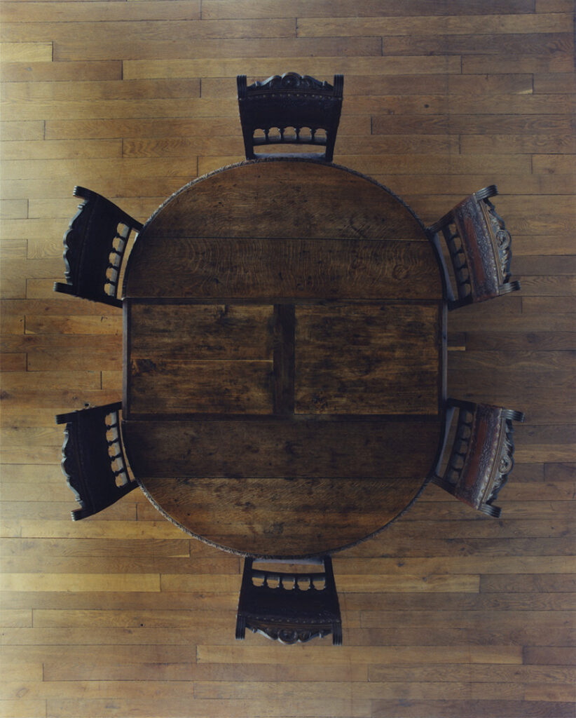 Emblème de la réunion familiale, cette table entourée de chaises est traitée sur le principe du motif. Dégagée de sa fonction, elle est rendue disponible pour d’autres représentations, d’autres images susceptibles de répondre par associations ou analogies.