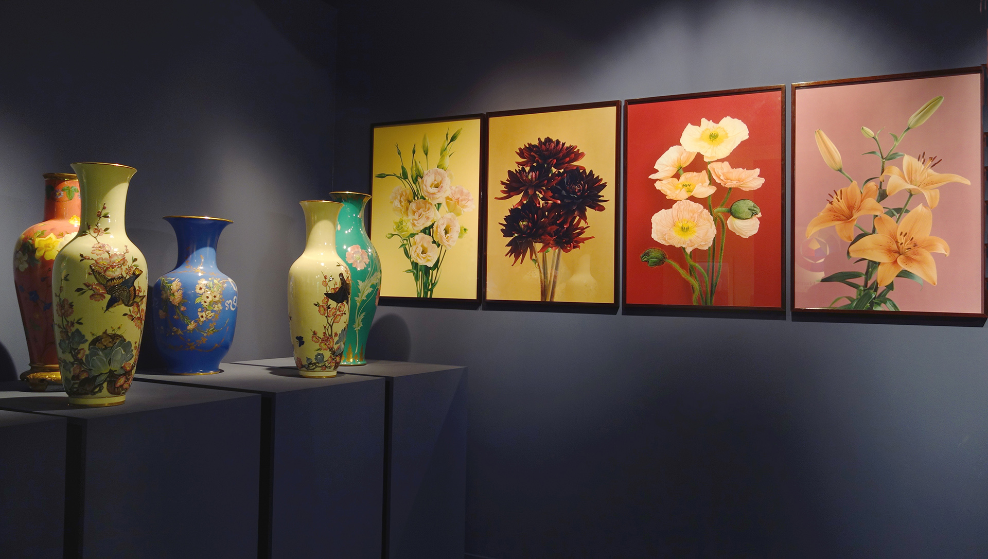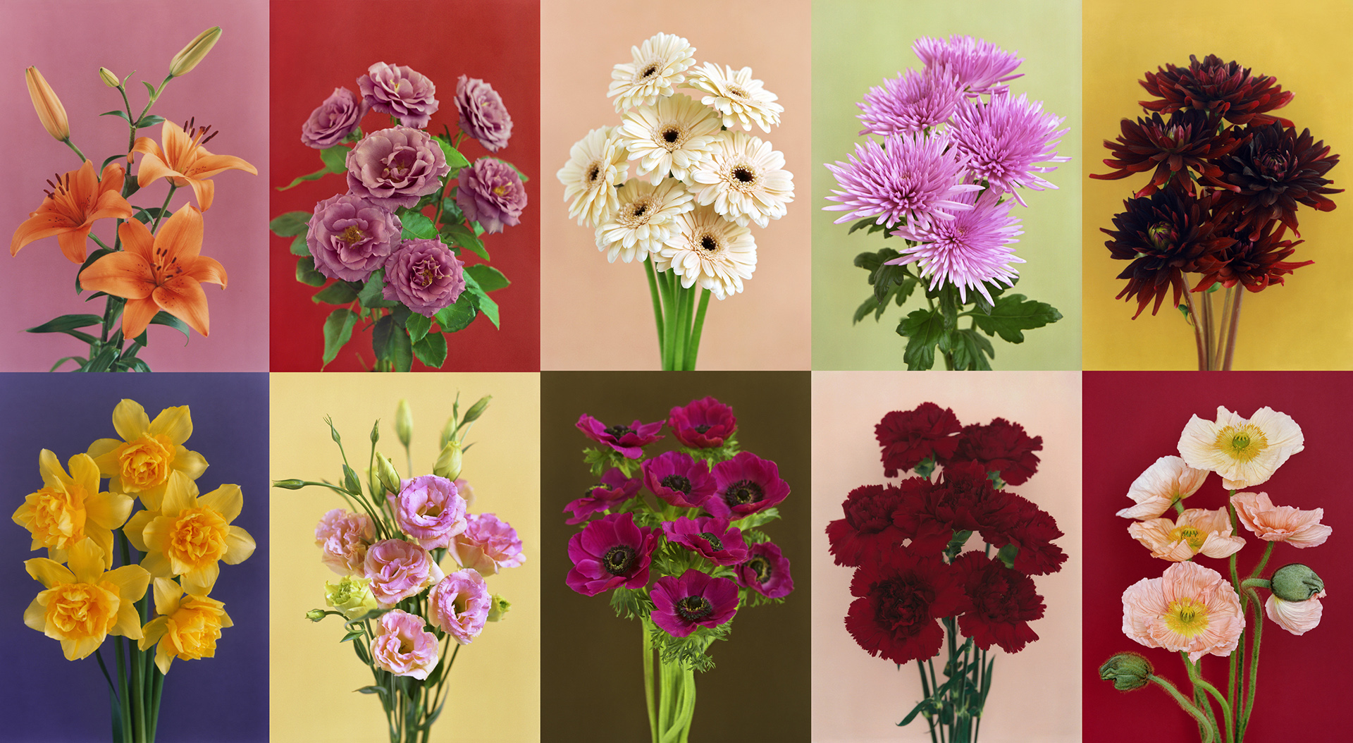 Composés pour l’objectif, ces faux vrais bouquets sont orientés vers la surface de l’image. Construits aussi précisément qu’un dessin ou une peinture, ils jouent des rapports entre la couleur des fleurs et celle du fond, passant d’une influence à une autre, tantôt chinoisante, flamande, ou pop. L’apparente simplicité du dispositif ouvre sur la diversité des variantes autour d’un même motif.